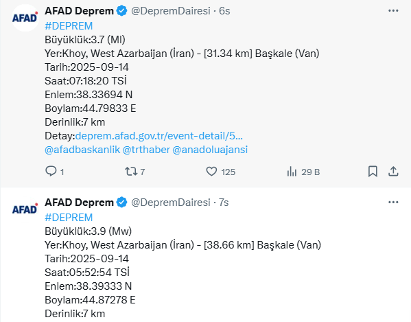 AFAD’ın resmi açıklamasına göre ilk deprem 14 Eylül 2025 sabahı saat 05.52’de kaydedildi. Büyüklüğü 3.9 (Mw) olarak ölçülen depremin merkezi İran’ın Khoy bölgesi olurken, Başkale ilçesine olan uzaklığı 38.66 km olarak belirlendi. Deprem yerin 7 km derinliğinde gerçekleşti.