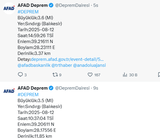 İlk deprem, 12 Ağustos 2025 günü saat 10:37:04’te 3.5 büyüklüğünde ve 11.85 km derinlikte kaydedildi. Bu sarsıntının ardından saat 14:59:26’da 3.6 büyüklüğünde ikinci bir deprem meydana geldi. İkinci depremin derinliği 3.37 km olarak ölçüldü. Her iki depremin de merkez üssü Sındırgı olarak belirlendi.