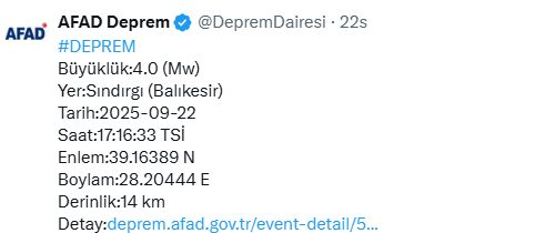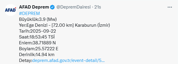 Afet ve Acil Durum Yönetimi Başkanlığı (AFAD), 22 Eylül 2025 tarihinde Türkiye’nin farklı bölgelerinde art arda iki depremin meydana geldiğini açıkladı. İlk deprem Balıkesir’in Sındırgı ilçesinde saat 17.16’da gerçekleşti. 4.0 büyüklüğündeki deprem, yerin 14 kilometre derinliğinde kaydedildi. İkinci deprem ise saat 18.53’te Ege Denizi açıklarında, İzmir’in Karaburun ilçesine 72 kilometre mesafede meydana geldi. 3.9 büyüklüğündeki deprem, 14.94 kilometre derinlikte ölçüldü.