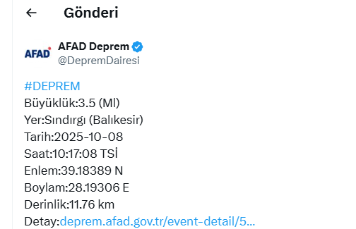 İkinci deprem ise saat 10.17’de Balıkesir’in Sındırgı ilçesinde meydana geldi. Bu depremin büyüklüğü de 3.5 (ML) olarak açıklandı ve 11.76 kilometre derinlikte kaydedildi.