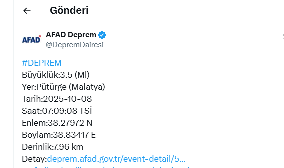 AFAD verilerine göre ilk deprem saat 07.09’da Malatya’nın Pütürge ilçesinde kaydedildi. Depremin büyüklüğü 3.5 (ML) olarak ölçülürken, yerin 7.96 kilometre derinliğinde gerçekleşti.