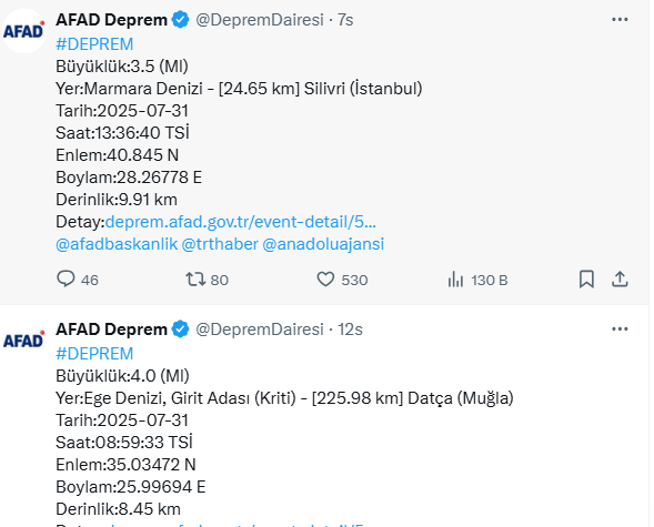 Afet ve Acil Durum Yönetimi Başkanlığı (AFAD), 31 Temmuz 2025 tarihinde Türkiye’yi tedirgin eden art arda iki deprem yaşandığını duyurdu.