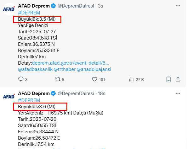 Afet ve Acil Durum Yönetimi Başkanlığı (AFAD), son 24 saat içerisinde Ege ve Akdeniz’de peş peşe meydana gelen depremler hakkında bilgi paylaştı.