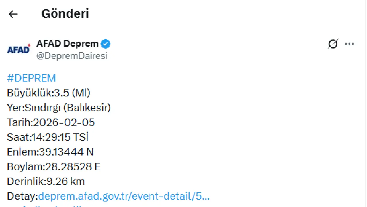 AFAD Deprem Dairesi’nin açıklamasına göre sarsıntı, Balıkesir’in Sındırgı ilçesinde kaydedildi. Depremin büyüklüğü 3.5 (Ml) olarak ölçülürken, yerin yaklaşık 9.26 kilometre derinliğinde gerçekleştiği bildirildi.