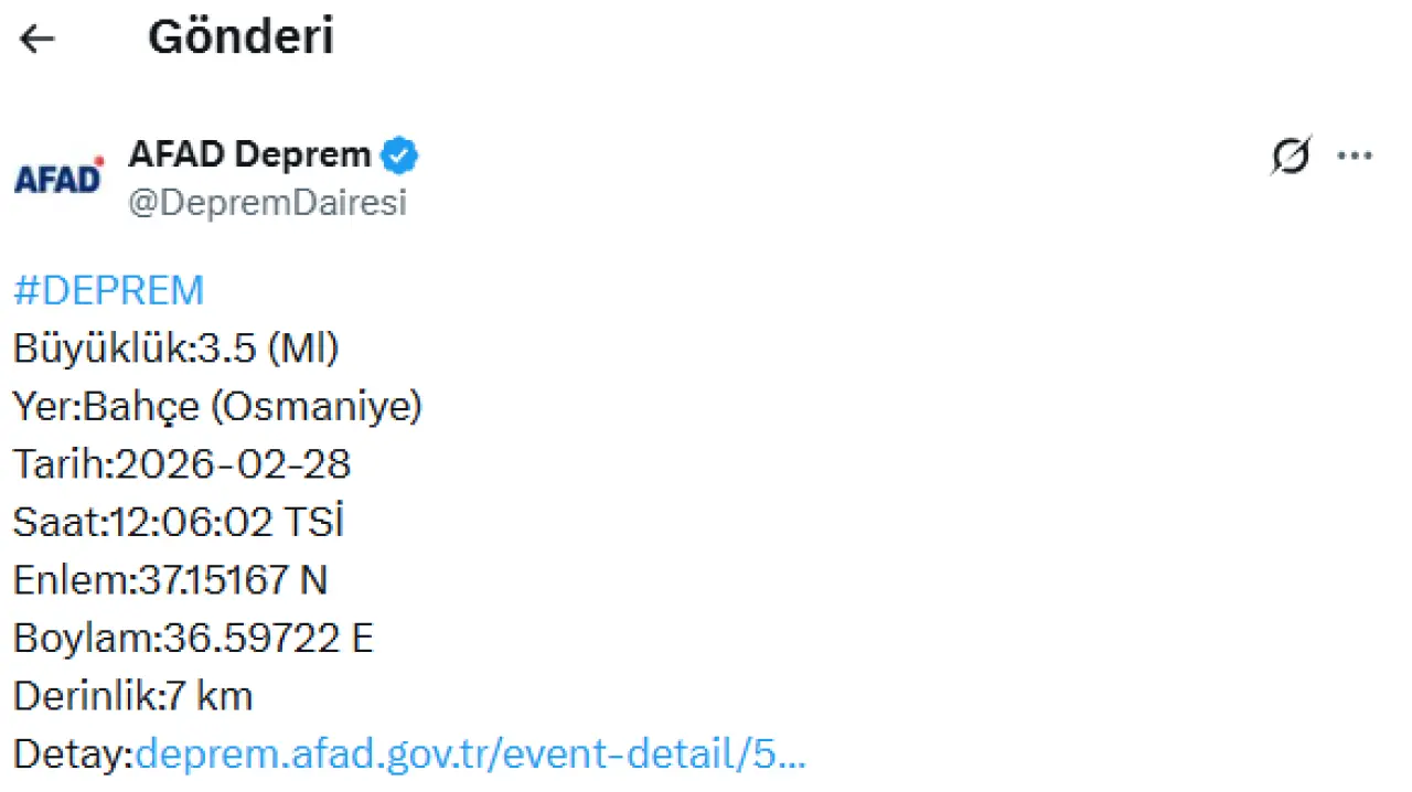 Türkiye bir kez daha deprem gerçeğiyle sarsıldı. Afet ve Acil Durum Yönetimi Başkanlığı (AFAD) tarafından yapılan açıklamaya göre, Osmaniye’nin Bahçe ilçesinde 28 Şubat 2026 tarihinde saat 12.06’da 3.5 büyüklüğünde bir deprem meydana geldi.