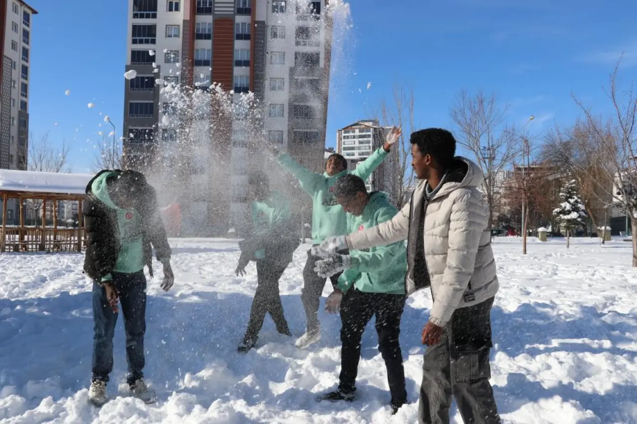 Kar yağışının başladığı ilk andan itibaren kendilerini dışarı atan 1. sınıf öğrencilerinin mutluluğu görülmeye değerdi. Alışık olmadıkları dondurucu soğuğa aldırış etmeyen Kenyalı Shueb Ahmed Abdikadir, yaşadığı heyecanı şu sözlerle anlatıyor: "Bu sene karı ilk defa görmenin heyecanını yaşadım. Arkadaşlarımla kartopu savaşı yapıp kardan adam yaptık. Kar tatili ilan edildiğinde de çok sevindik, karda oynamak gerçekten çok heyecanlıydı." Malili Bekaye İbrahim Diaby ise yaşadığı manevi huzuru dile getirerek, kendi ülkesinde kar yağmadığını ancak Sivas’ın sunduğu bu fırsatın içini yeni hislerle doldurduğunu vurguladı. Gençler, dondurucu havayı kartopu savaşlarıyla ısıtarak gönüllerince eğlendi.