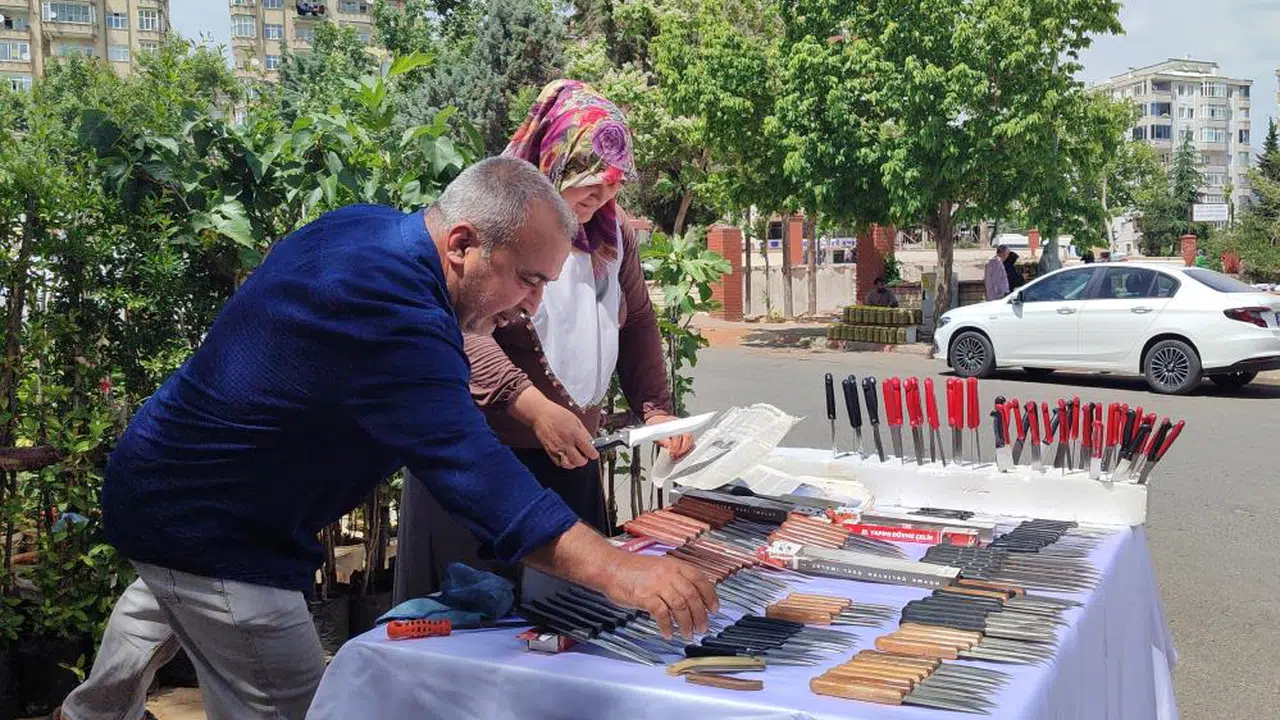 Kardeşleriyle bıçakçılık yapan 50 yaşındaki Müslim Okutucu'ya, 4 çocuk annesi eşi Fatma Okutucu'da (44) yardım ediyor. Çift, bayrama sayılı günler kala Merkez Onikişubat İlçesi Necip Fazıl Kültür Merkezi arkasında bıçak satıp bileme yapıyor.