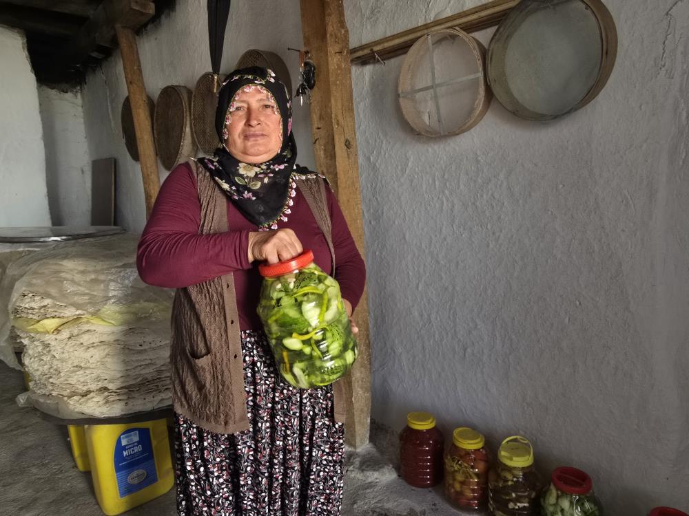 “Her şeyimizi yaparız. Yufka ekmeklerimizi yaptık. Turşularımızı yapıyoruz. Menemen yaptık. Konservelerimizi yapıyoruz. Erişte ve mantı kestik, kayısı erik kurusu yaptık. Sarma için yaprak yaptım. Yaptığım her şey kendi bahçemizden.”