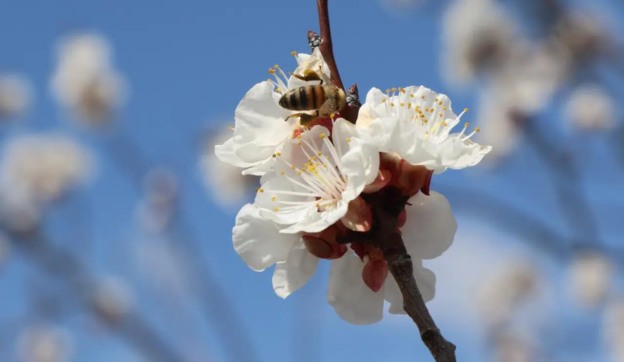 Karlı dağların altında çiçek açan kayısı ağaçlarından bal özü toplamaya başlayan arılar doğal güzellik oluşturdu.