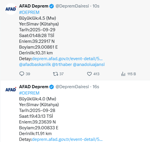 Afet ve Acil Durum Yönetimi Başkanlığı (AFAD), Kütahya’nın Simav ilçesinde art arda iki deprem meydana geldiğini açıkladı. İlk belirlemelere göre can ve mal kaybı yaşanmadı.