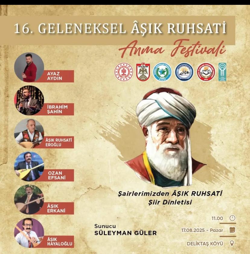 Sivas’ta düzenlenecek 16. Geleneksel Aşık Ruhsati Anma Festivali, usta aşıkları ve şiir tutkunlarını Deliktaş Köyü’nde buluşturacak.