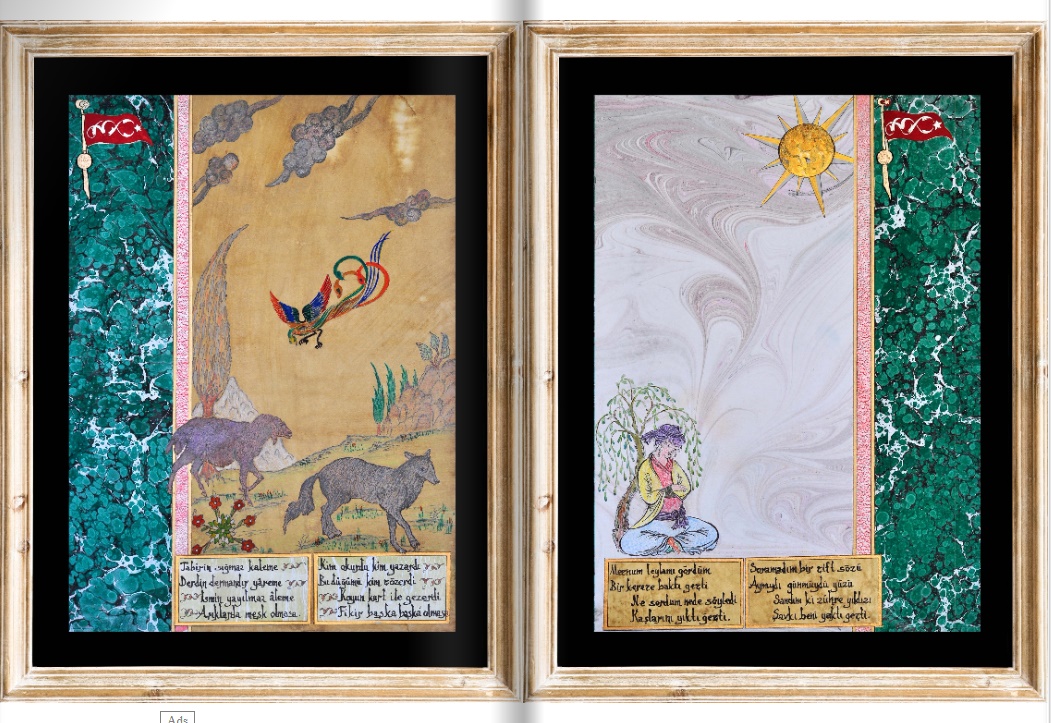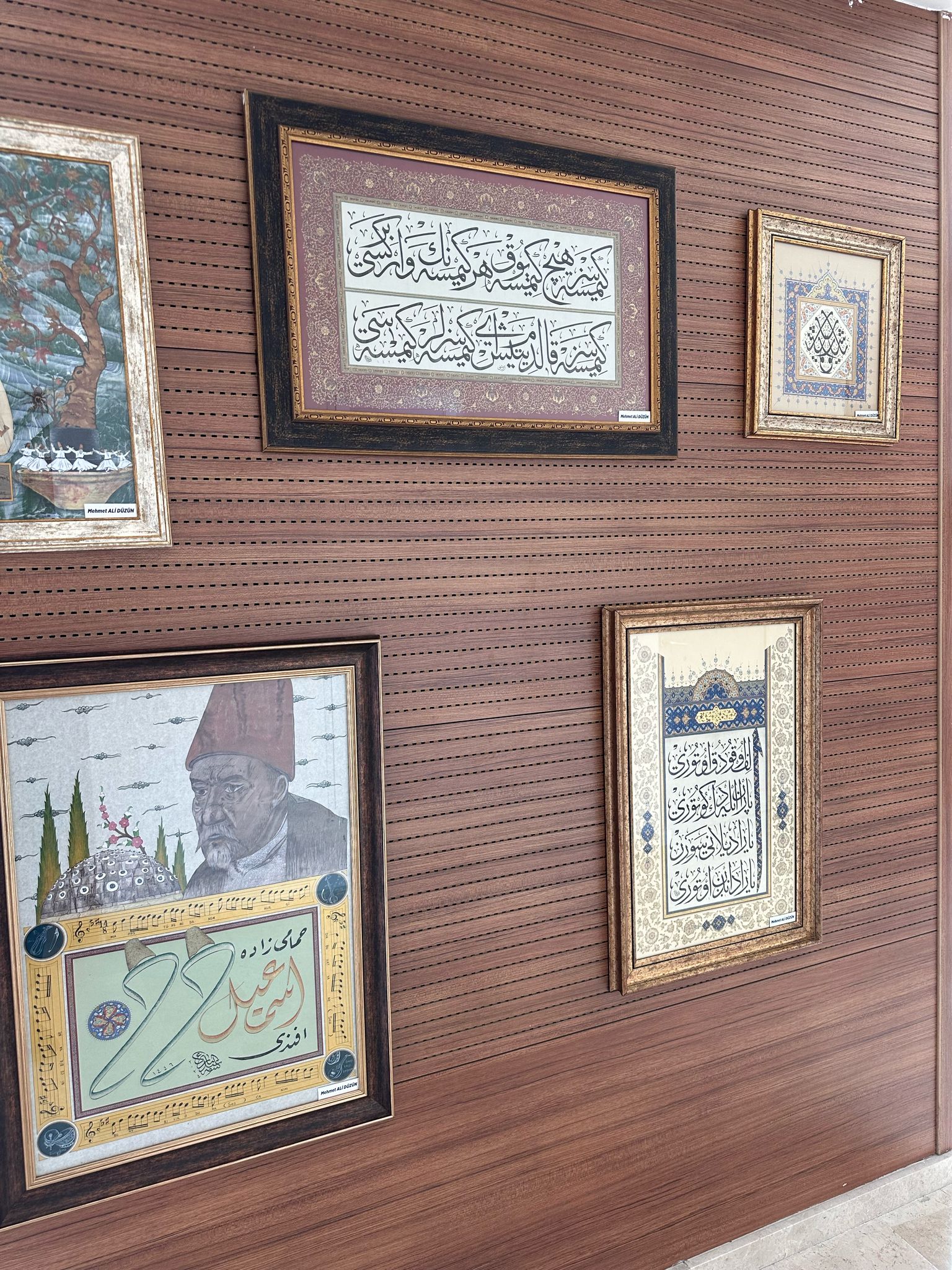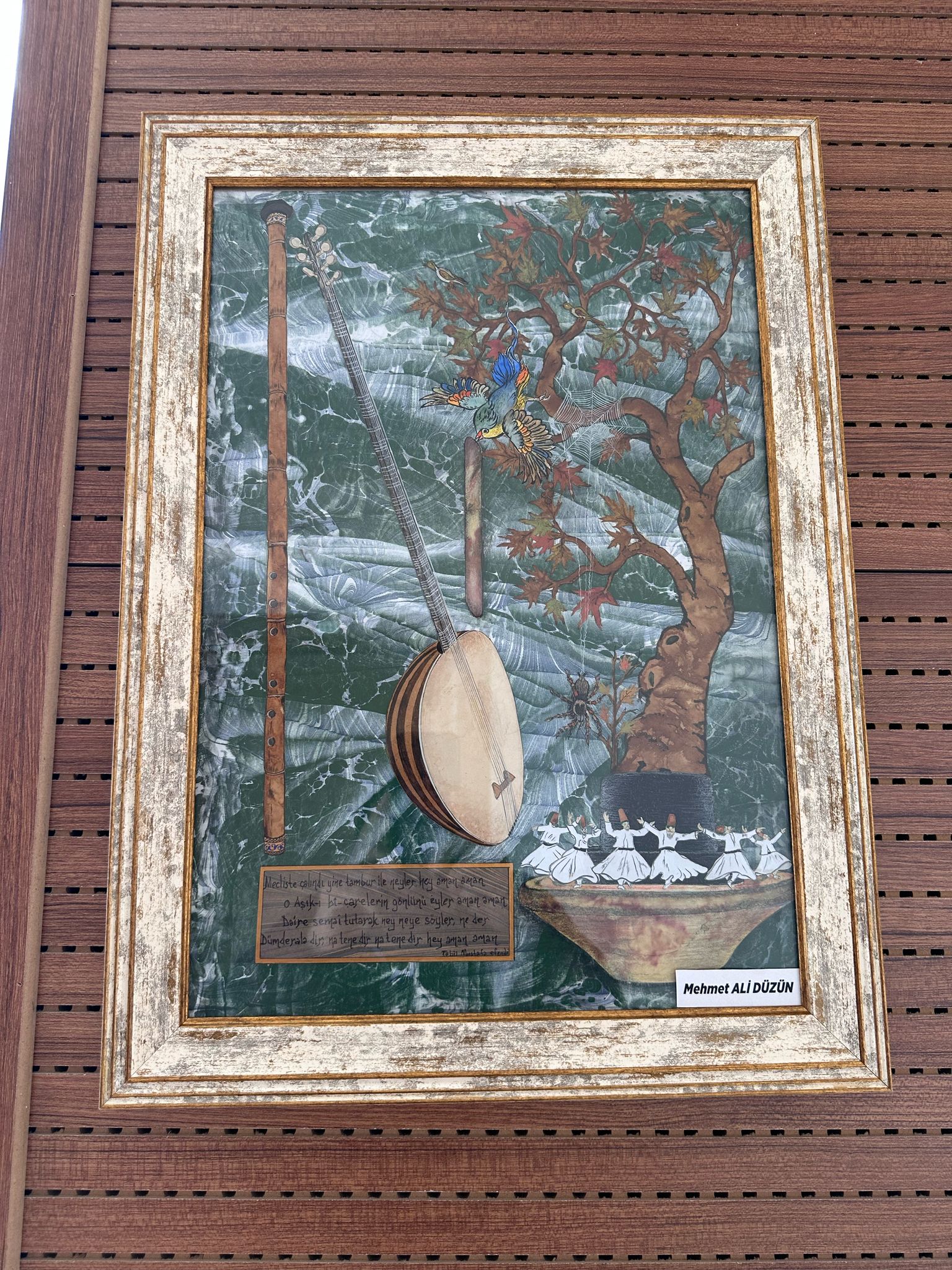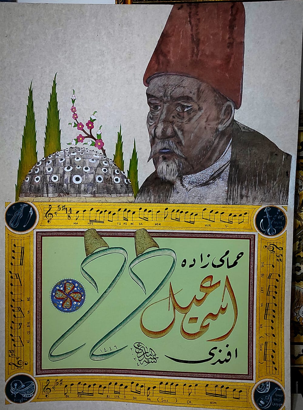 "Bir hattat dostumuzun oğluma hediye ettiği 'Hamamcızade İsmail Dede Efendi' yazısını tablolaştırdık. Dede Efendi'nin hamamcı kültüründen gelen mahlasına ithafen hamam kubbesi çalıştık, Hüzzam Ayin-i Şerif'ini ekledik, çevresine Türk sazlarını minyatürlerle işledik ve yaşadığı döneme ait bir resmini de kullandık."