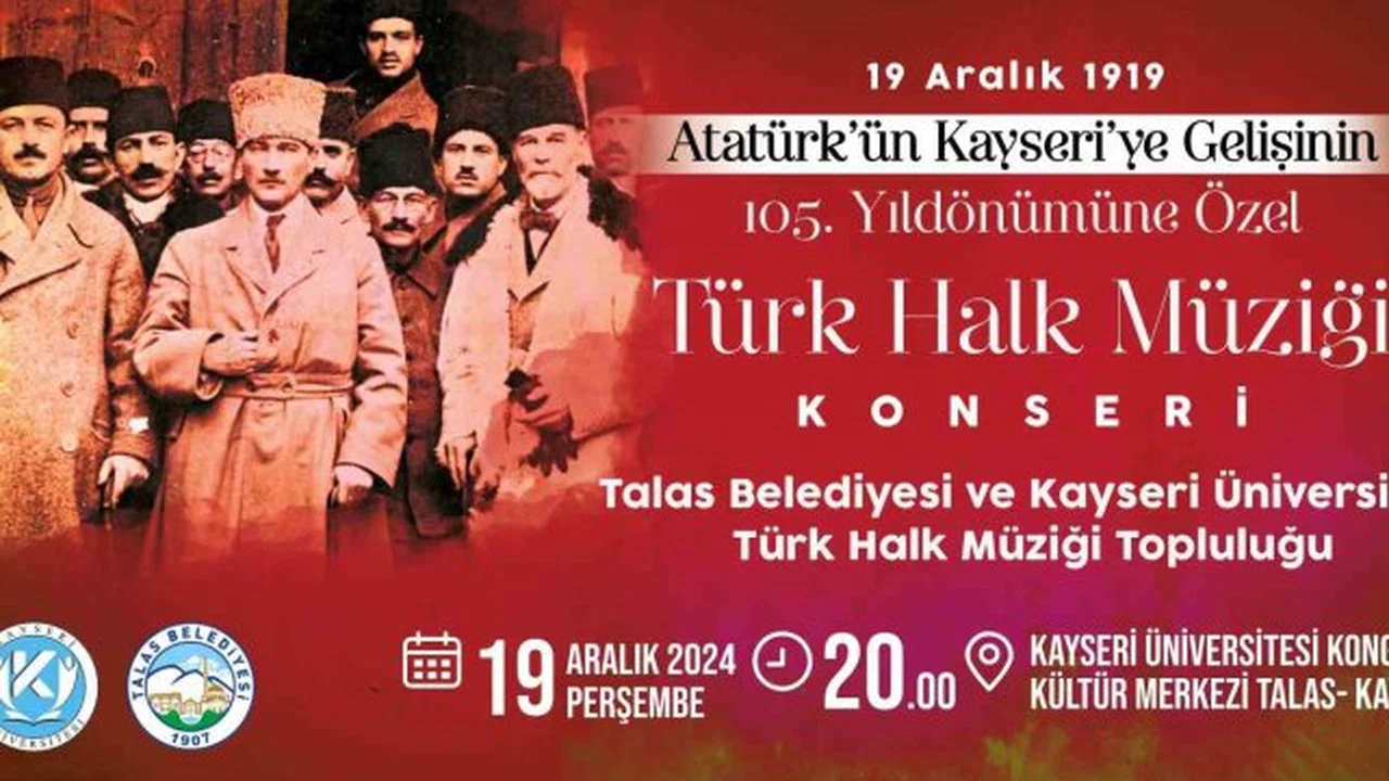 Talas Belediyesi ve Kayseri Üniversitesi (KAYÜ) Türk Halk Müziği Toplulukları, Atatürk'ün Kayseri'ye gelişinin 105. yılı münasebetiyle ortak bir konser verecek.
