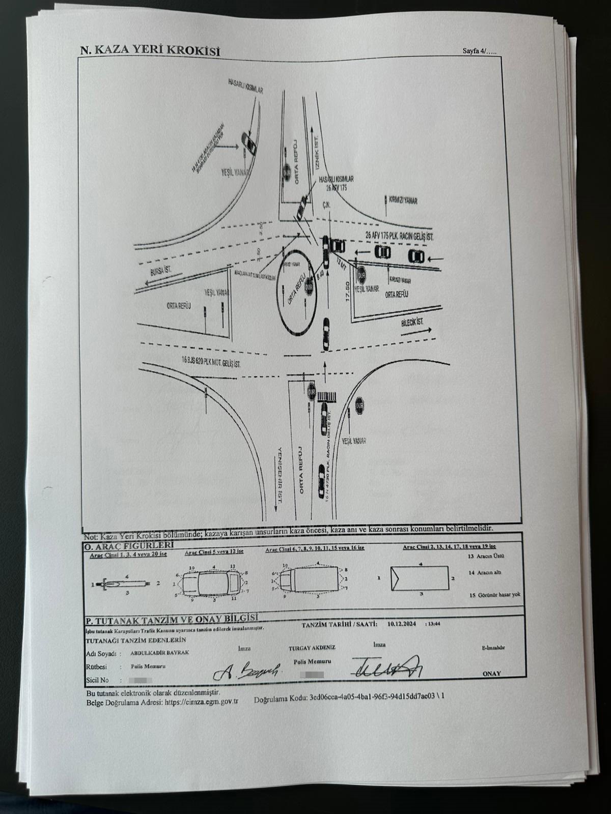 Kaza sonrası polis ekiplerinin tutanaklarına sürücü Alev Akkaya Karabacakoğlu'nun “kırmızı ışık ihlali” yaptığı, sürücü Hüseyin Şen'in kusuru bulunmadığı işlendi. Ayrıca sürücü Karabacak'ın kaza esnasında 5'inci viteste seyrettiği ortaya çıktı.