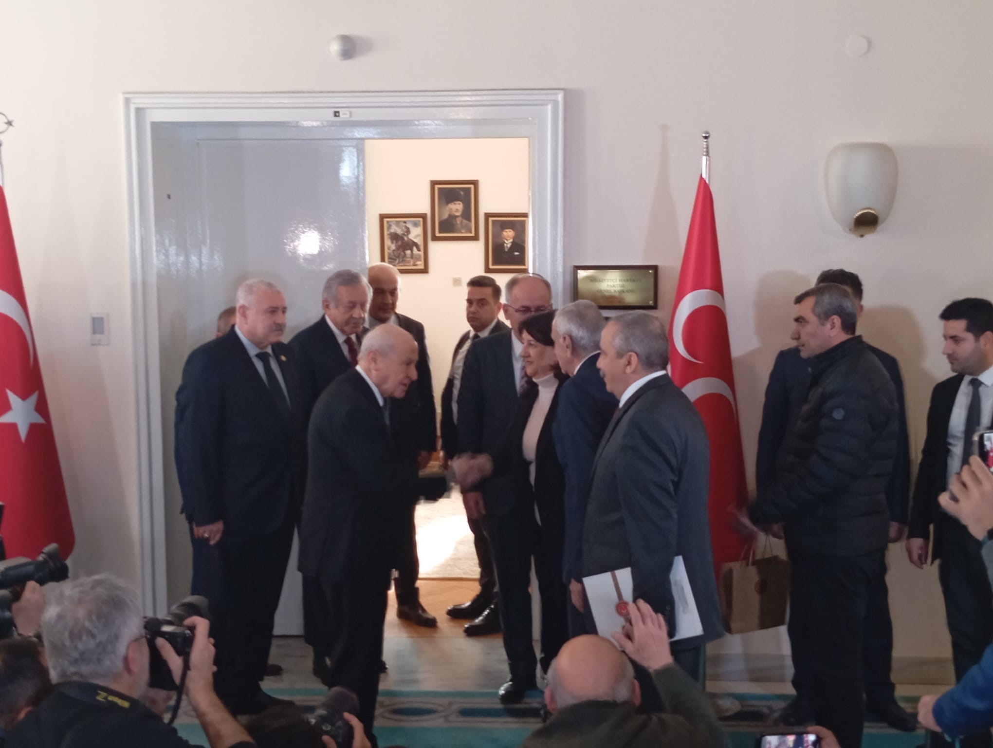 Heyet, Kurtulmuş ile olan görüşmesinin ardından TBMM"de MHP Genel Başkanı Devlet Bahçeli ile bir araya geldi. Bahçeli"nin TBMM"deki makamında gerçekleşen görüşme öncesinde Bahçeli, DEM Partili heyeti kapıda karşılayarak, heyetle tokalaştı. Görüşmede Bahçeli"ye MHP İstanbul Milletvekili Celal Adan da eşlik etti