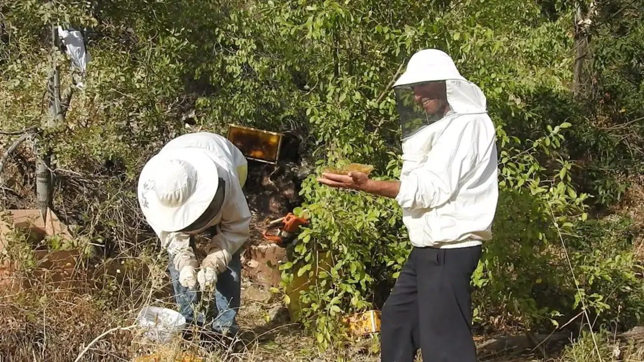 Erzincan’da kovanlardan ayrılıp kuru ağaç gövdesi ve kayalıklara yuva yapan arıların yaptığı ballar, su kenarlarında takip ettikleri arıların yuvasına ulaşan bal avcıları tarafından çıkarılıyor.