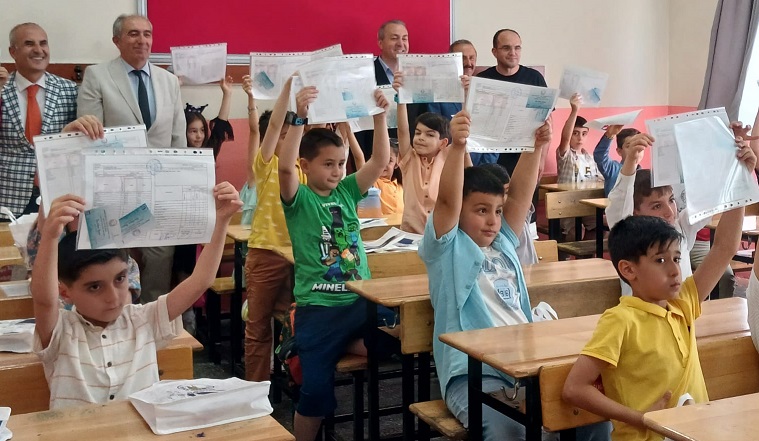 Törende öğrencilerin karne heyecanına ortak olan Başkan Uzun, çocuklara karnelerini takdim ederek, Sivasspor forması hediye etti.