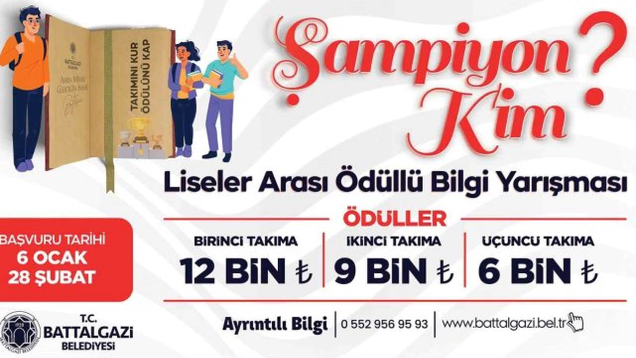 Battalgazi Belediyesi lise öğrencilerine yönelik bilgi yarışması düzenleyecek. 'Şampiyon Kim' adlı yarışma 27 bin TL'lik ödül havuzuyla gençlerin bilgi birikimini taçlandırmayı hedefliyor.