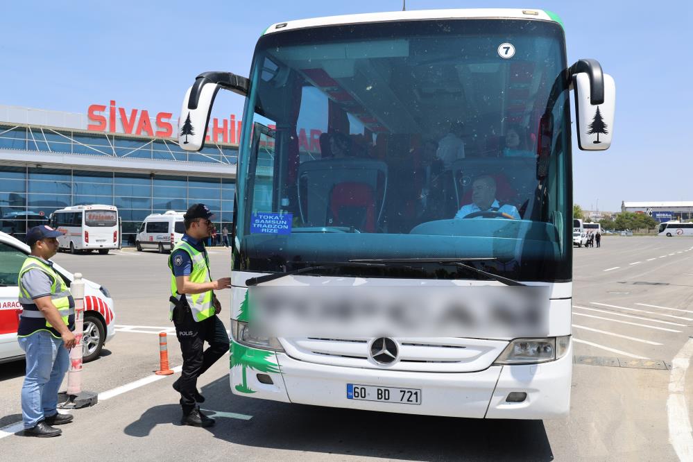 Bayram tatilinin başlamasıyla birlikte artan trafik yoğunluğu kazaları da beraberinde getiriyor. Trafik kazalarına karşı denetimlerini artıran Sivas İl Emniyet Müdürlüğü'ne bağlı ekipleri, sürücüleri kurallara uymaları konusunda uyarıyor. Şehirlerarası Otobüs Terminali'nde denetim yapan ekipleri ziyaret eden Sivas Valisi Yılmaz Şimşek ve Belediye Başkanı Adem Uzun, yolcular ve otobüs sürücülerine de uyarılarda bulundu. Emniyet kemeri takılması gerektiğini ifade eden protokol üyeleri, vatandaşların bayramını tebrik etti.