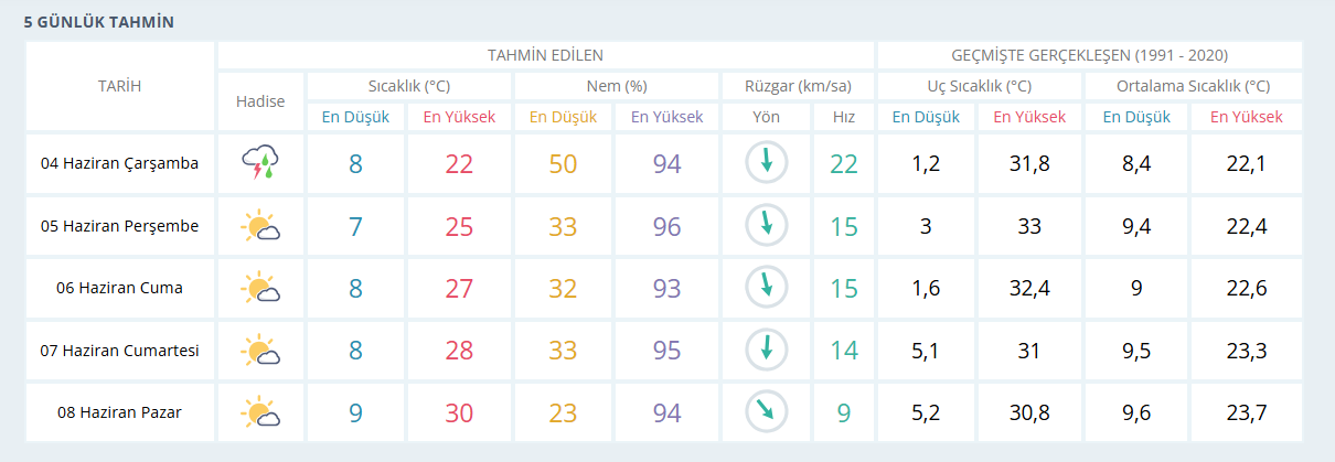 05 Haziran Perşembe: Sıcaklıklar biraz daha artacak; en düşük 7°C, en yüksek 25°C öngörülüyor. Rüzgar hızı 15 km/sa ile hafifleyecek.