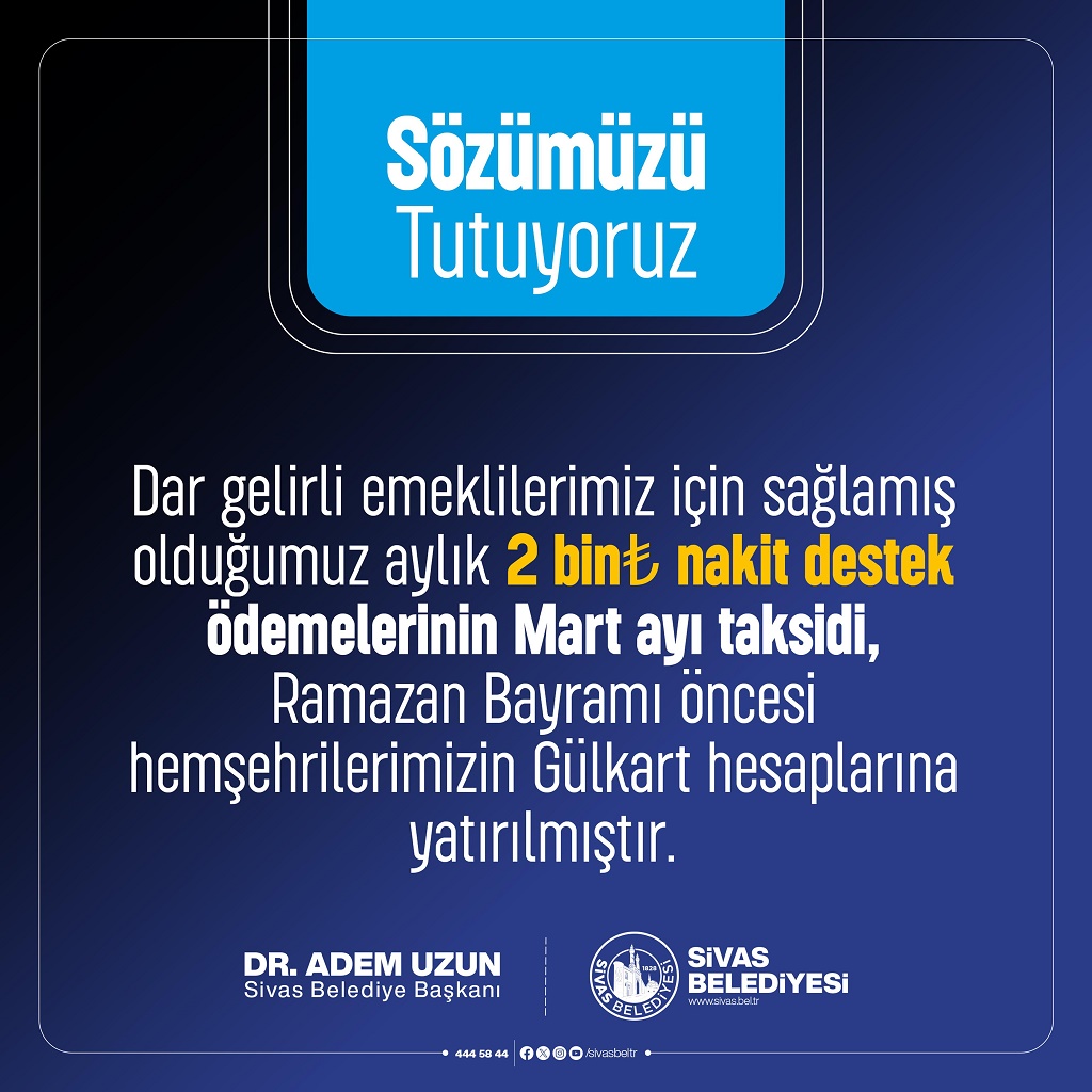 Sivas Belediyesi, dar gelirli emeklilere sağladığı 2 bin TL'lik nakit desteğin Mart ayı ödemesini hesaplara yatırdı.