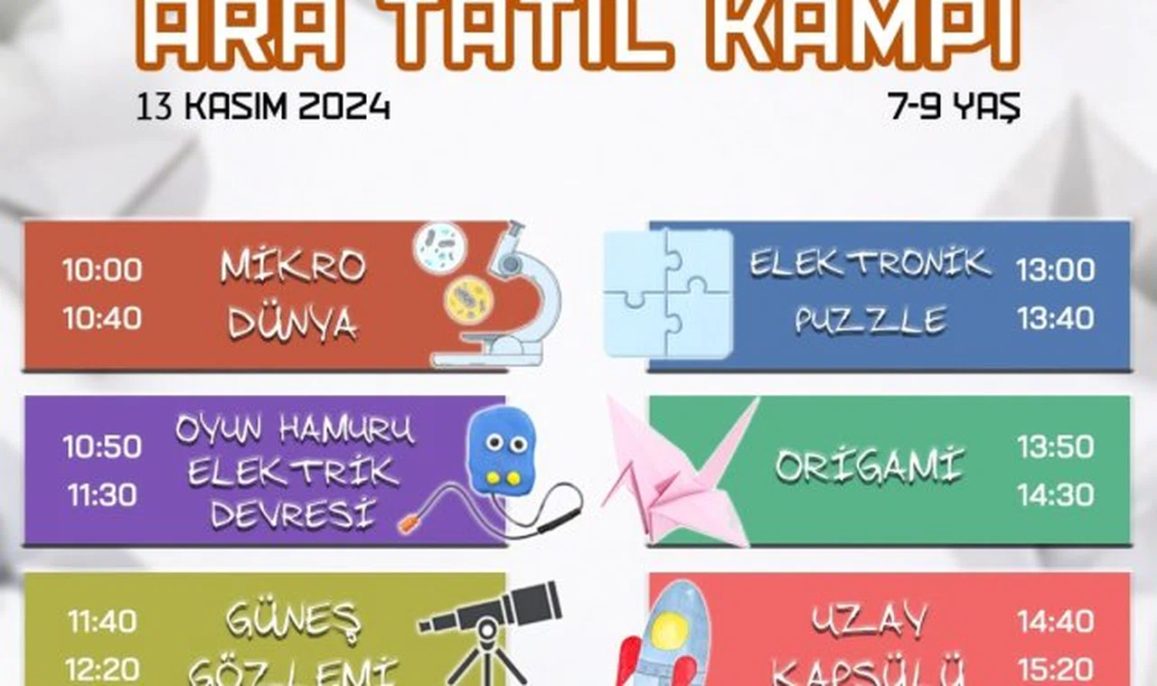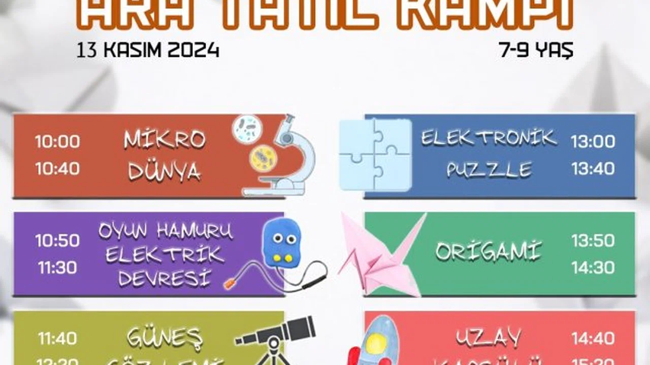 Türkiye'deki 6 destekli bilim merkezinden birisi olan Kayseri Bilim Merkezi, eğitim ve bilime önem vererek, ara tatil döneminde miniklere hem eğlenceli hem öğretici bir tatil deneyimi sunmayı hedefliyor. Kayseri Bilim Merkezi eğitmenleri tarafından hazırlanan programda, 13 Kasım'da 7-9 yaş grubundaki çocuklar için 'Mikro Dünya', 'Elektronik Puzzle', 'Oyun Hamuru Elektrik Devresi', 'Origami', 'Güneş Gözlemi' ve 'Uzay Kapsülü' gibi interaktif atölyeler yer alacak. 14 Kasım'da ise 10-13 yaş aralığındaki çocuklar için 'DNA Modeli', 'Elektroskop', 'Lego Wedo', 'Ahşap Tasarım', 'Güneş Gözlemi' ve 'Oryantiring' gibi farklı bilimsel ve eğitici etkinlikler düzenlenecek.