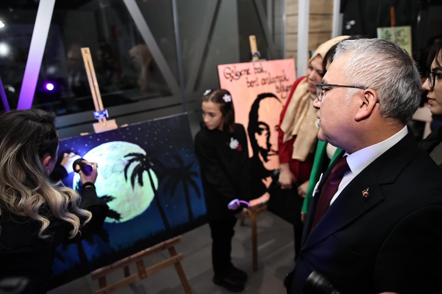 Bu yıl ikincisi düzenlenen sergide yer alan 62 eser, karanlıkta parlayan neon boyalarla özel bir teknik kullanılarak hazırlandı. Bu özelliğiyle karanlıkta görünür olan resim çalışmaları büyük beğeni topladı. Vali Şimşek, serginin hazırlanmasında emeği olan öğrenci ve öğretmenleri tebrik etti.