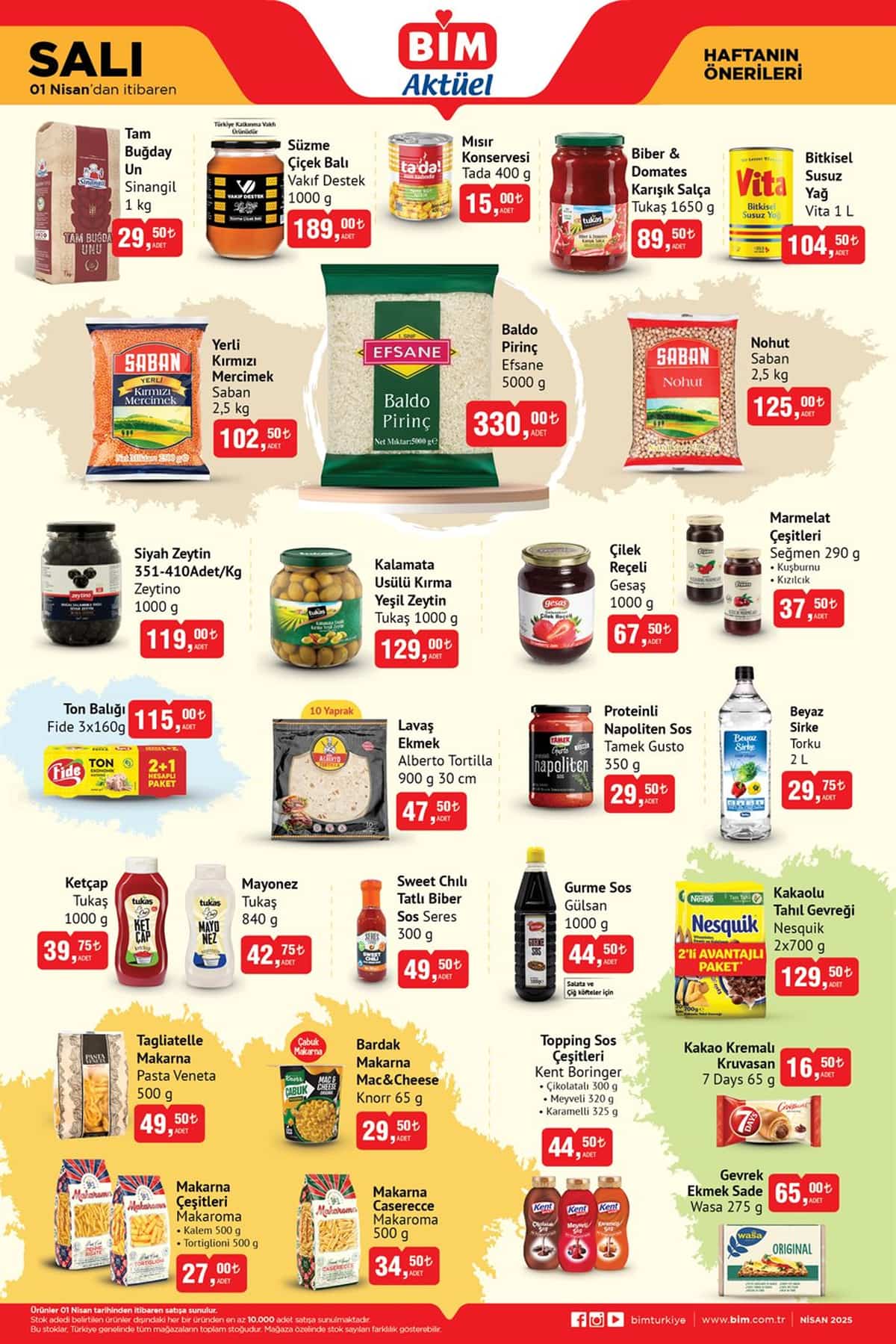 BİM Market, 1 Nisan 2025 Salı günü başlayacak ve 8 Nisan 2025 tarihine kadar devam edecek yeni aktüel kataloğunu duyurdu. "Haftanın Önerileri" kampanyası kapsamında temel ihtiyaç ürünlerinde cazip indirimler sunan BİM, kişisel bakım, temizlik, süt ve süt ürünleri, kahvaltılıklar, içecekler ve atıştırmalık kategorilerinde birbirinden avantajlı fiyatlarla müşterilerini bekliyor.