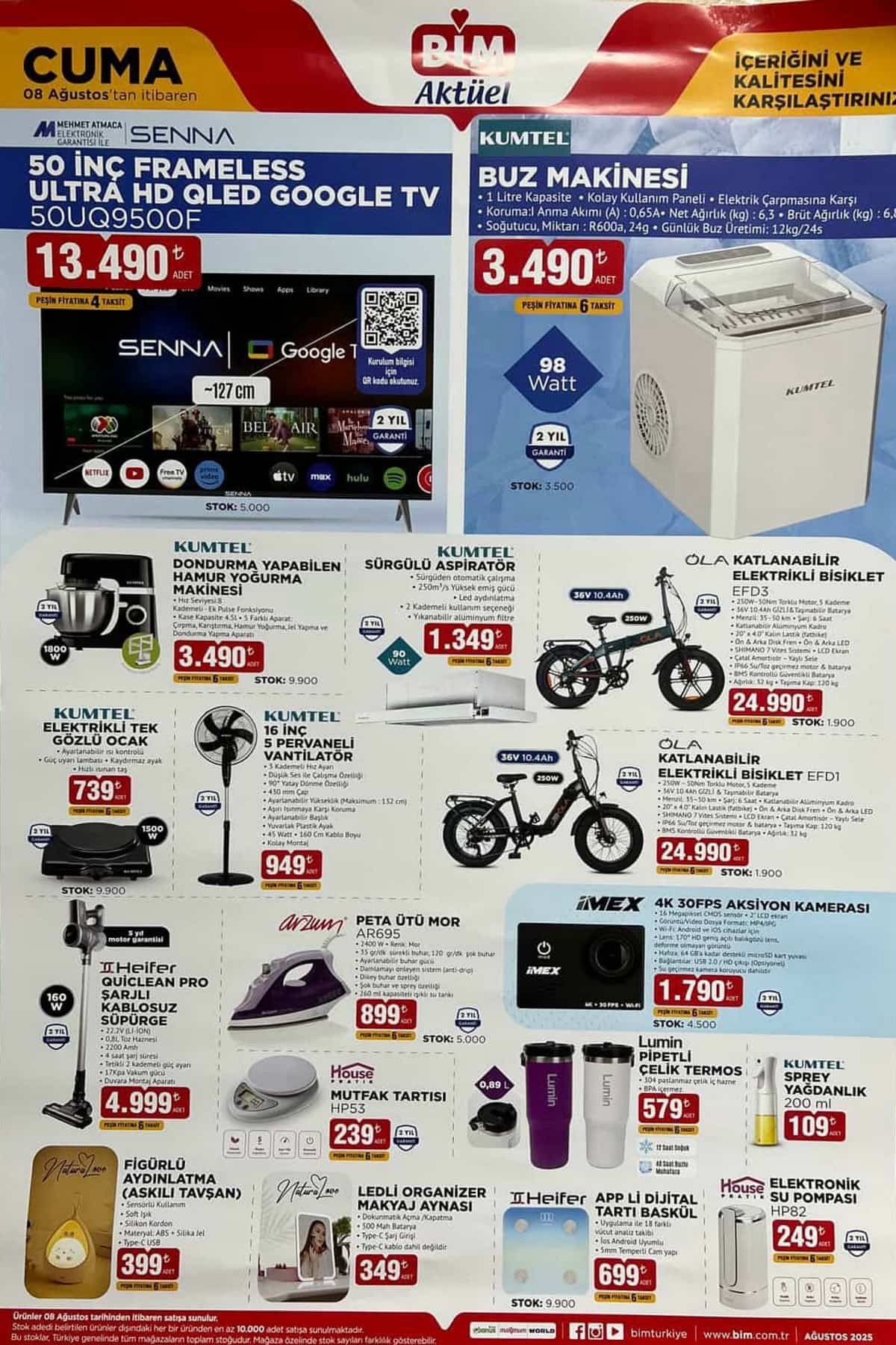 BİM 8 Ağustos 2025 aktüel kataloğunun en dikkat çeken ürünü, SENNA markasına ait 50 İnç Frameless HD QLED Google TV oldu. 13.490 TL fiyat etiketiyle satışa sunulan bu ürün, Google işletim sistemi sayesinde uygulama yükleme desteği sunuyor ve 2 yıl servis garantisi ile geliyor.