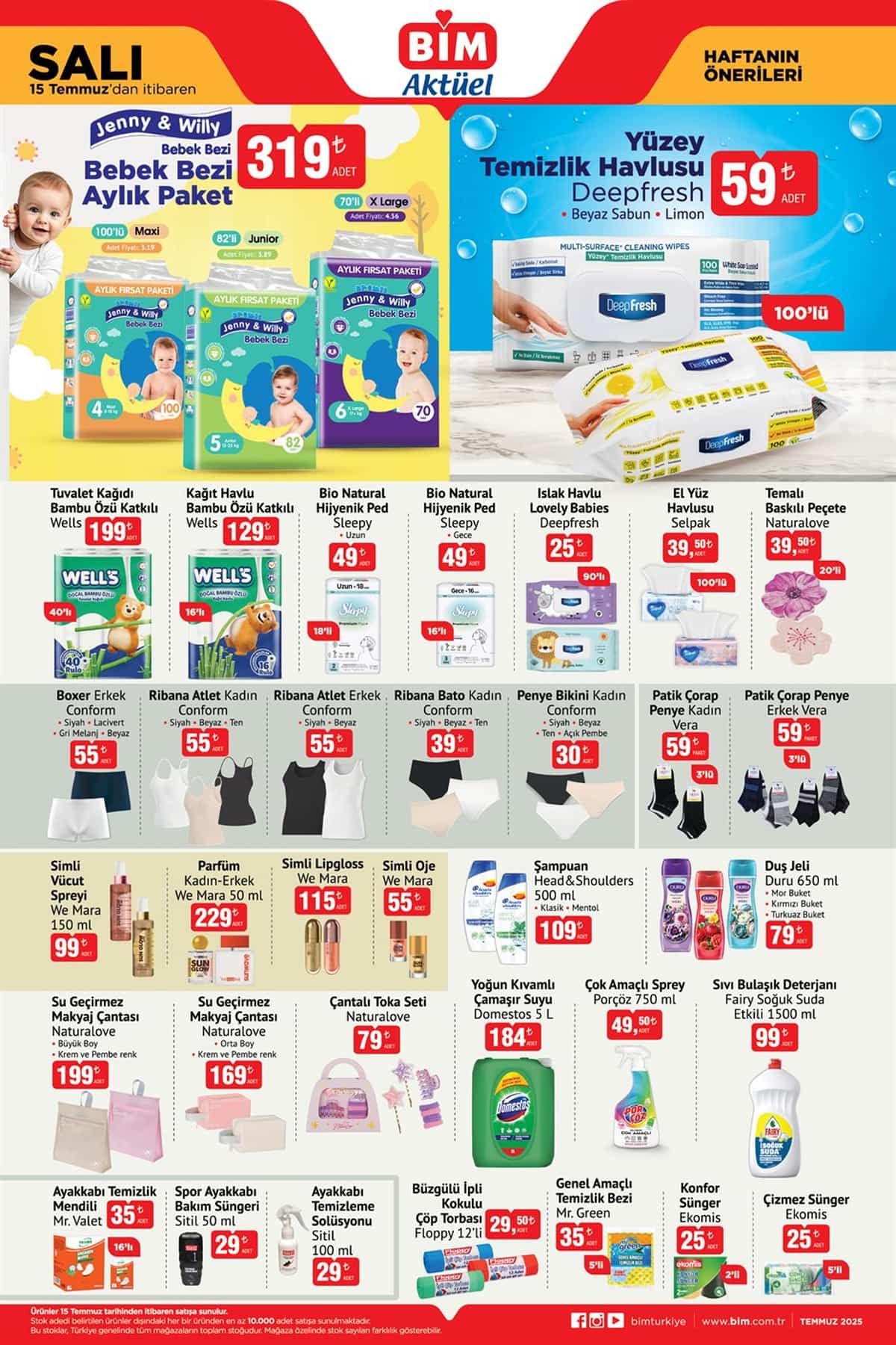 15 Temmuz 2025 Salı günü itibarıyla geçerli olacak bu kampanya ürünleri, Bim Aktüel Kataloğu farkıyla indirim reyonlarında müşterilerini bekliyor olacak. Kaliteli ürünleri uygun fiyatlarla almak isteyenler için bu hafta Bim fırsatlarla dolu!