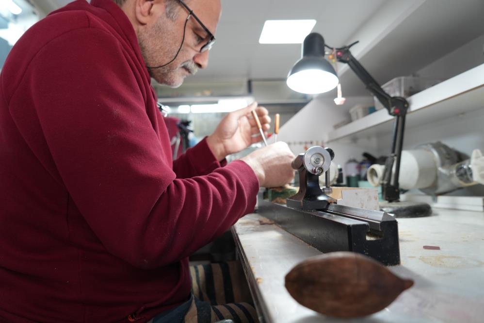 Erzincanlı tespih işlemecisi Mehmet Aydın, Brezilya'da yetişen kuka ağacının meyvesini bin bir zahmet ve emekle işleyerek tespih ve takılara dönüştürüyor.