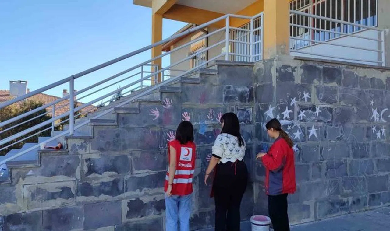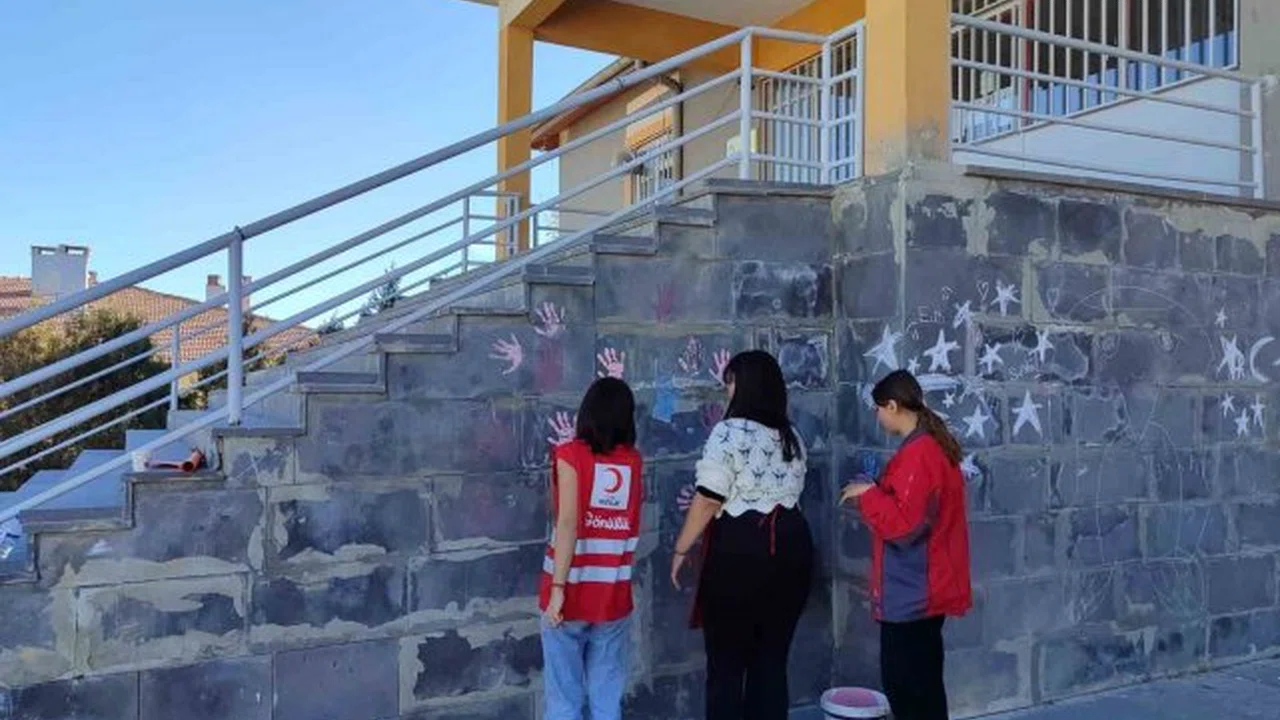 Kayseri'nin Bünyan ilçesinde, belediye destekleri ile Genç Kızılay ekibi tarafından Neşeli Okul Yolum Projesi çerçevesine okul yolları ve duvarları renklendirildi.