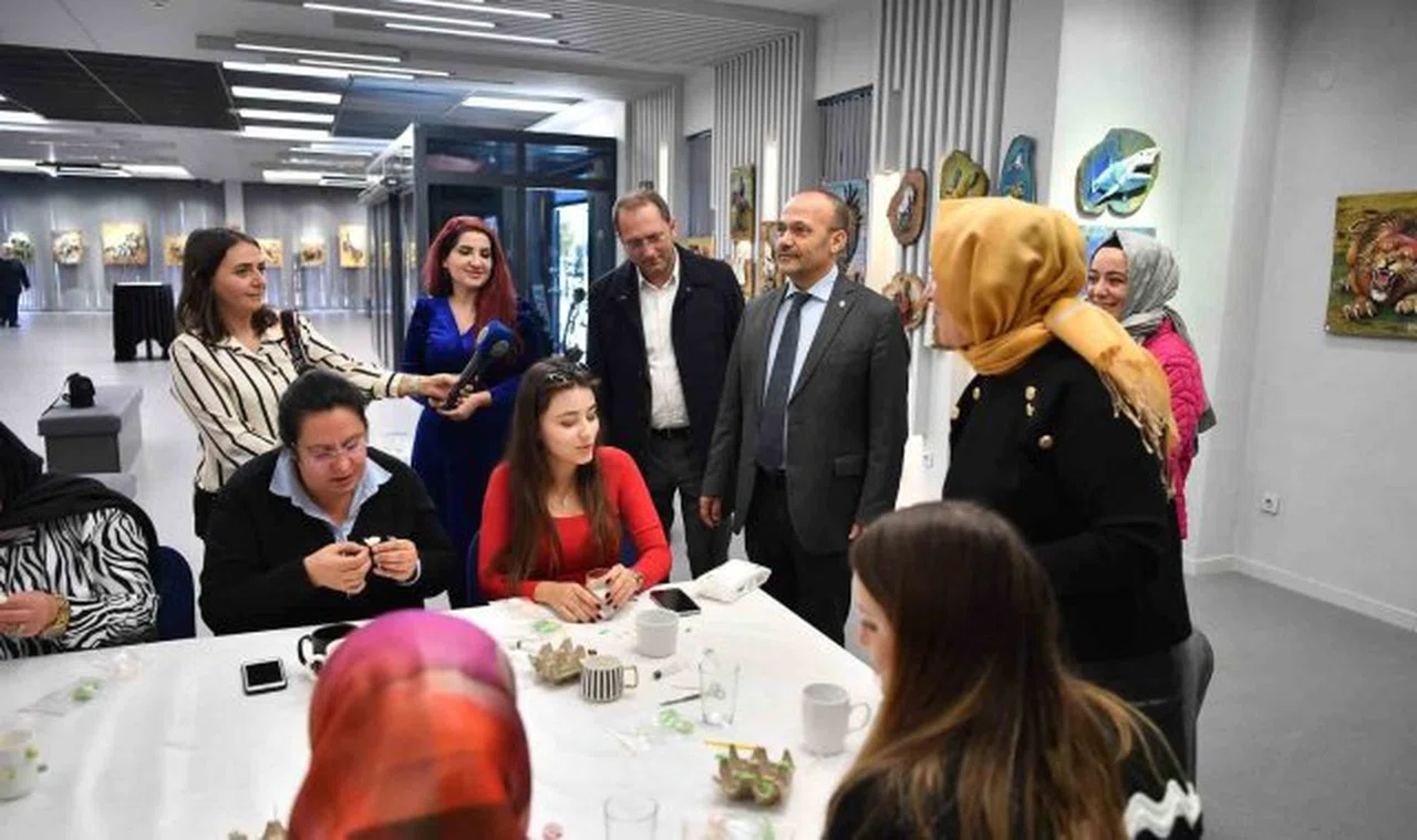 Büyükşehir Belediyesi Genel Sekreter Yardımcısı Mücahid Soyak da KAYMEK Sanat Galerisi'ni ziyaret etti. Soyak, etkinliğe katılan kadınlarla sohbet ederek, devamlı açtıkları bu tür kurslara herkesi davet etti.