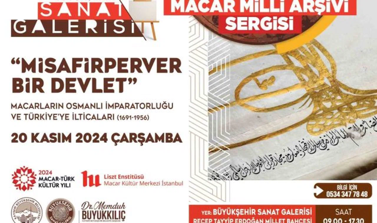 Kayseri Büyükşehir Belediyesi, Türkiye Cumhuriyeti-Macaristan ezeli ve ebedi kardeşliğini anlatmak amacıyla Macar Milli Arşivi'nden 19 eseri, 'Misafirperver Bir Devlet' Sergisi ile sanatseverlerle buluşturmaya hazırlanıyor. Büyük Şehir Sanat Galerisi'nde düzenlenecek anlamlı serginin açılış töreni, 20 Kasım Çarşamba günü saat 12.30'da gerçekleştirilecek.