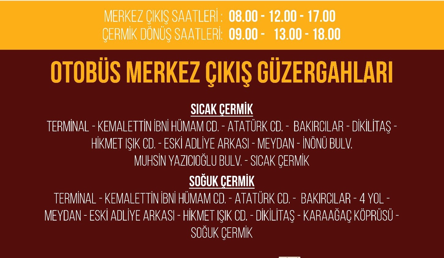 Sıcak Çermik ve Soğuk Çermik güzergahında yolcu taşıyan otobüsler kent merkezinden 08:00-12:00-17:00 saatlerinde çıkacak. Çermiklerden dönüş saatleri ise 09:00-13:00-18:00 şeklinde olacak.