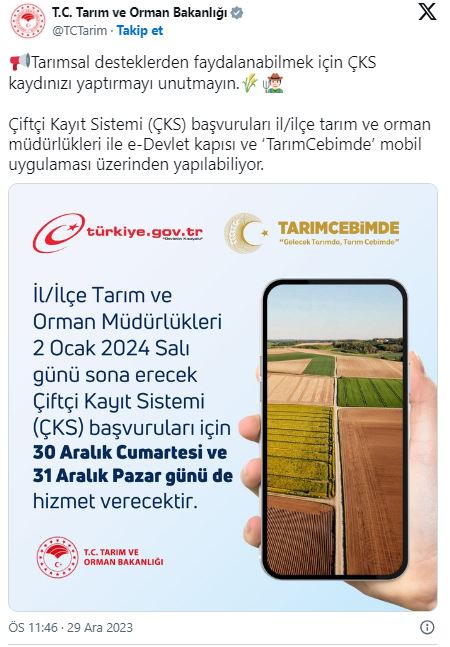 Bakanlığın açıklamasında, "Çiftçi Kayıt Sistemi başvuruları il/ilçe tarım ve orman müdürlükleri ile e-Devlet kapısı ve 'TarımCebimde" mobil uygulaması üzerinden yapılabiliyor" ifadelerine yer verildi.