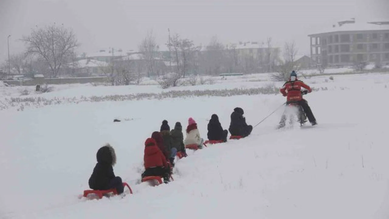Erzincan'da karla kaplanan boş arazide toplanan çocuklar, kros motorunun arkasına bağlanan kızaklarla doyasıya kaymanın tadını çıkardı.