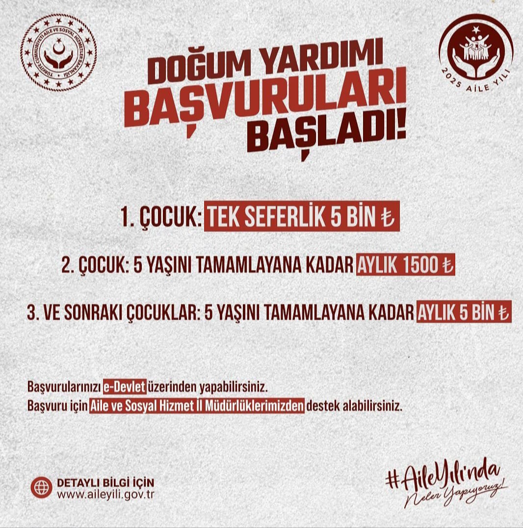 E-Devlet’e erişim sağlayamayan vatandaşlar ise Aile ve Sosyal Hizmetler İl Müdürlüklerinden destek alabilecek. Yardımlar, herhangi bir kriter aranmaksızın 1 Ocak 2025 sonrası doğan çocuklar için geçerli olacak.