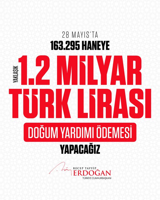 Cumhurbaşkanı Recep Tayyip Erdoğan, 28 Mayıs’ta yapılacak ilk doğum yardımı ödemesiyle ilgili açıklamasında, toplamda 163 bin 295 aileye yaklaşık 1,2 milyar liralık destek sunulacağını belirtti. Erdoğan, bu yardımın anneler ve çocukları için hayırlı olmasını dileyerek, devletin aileyi önceleyen sosyal politikalarını sürdüreceğini vurguladı.