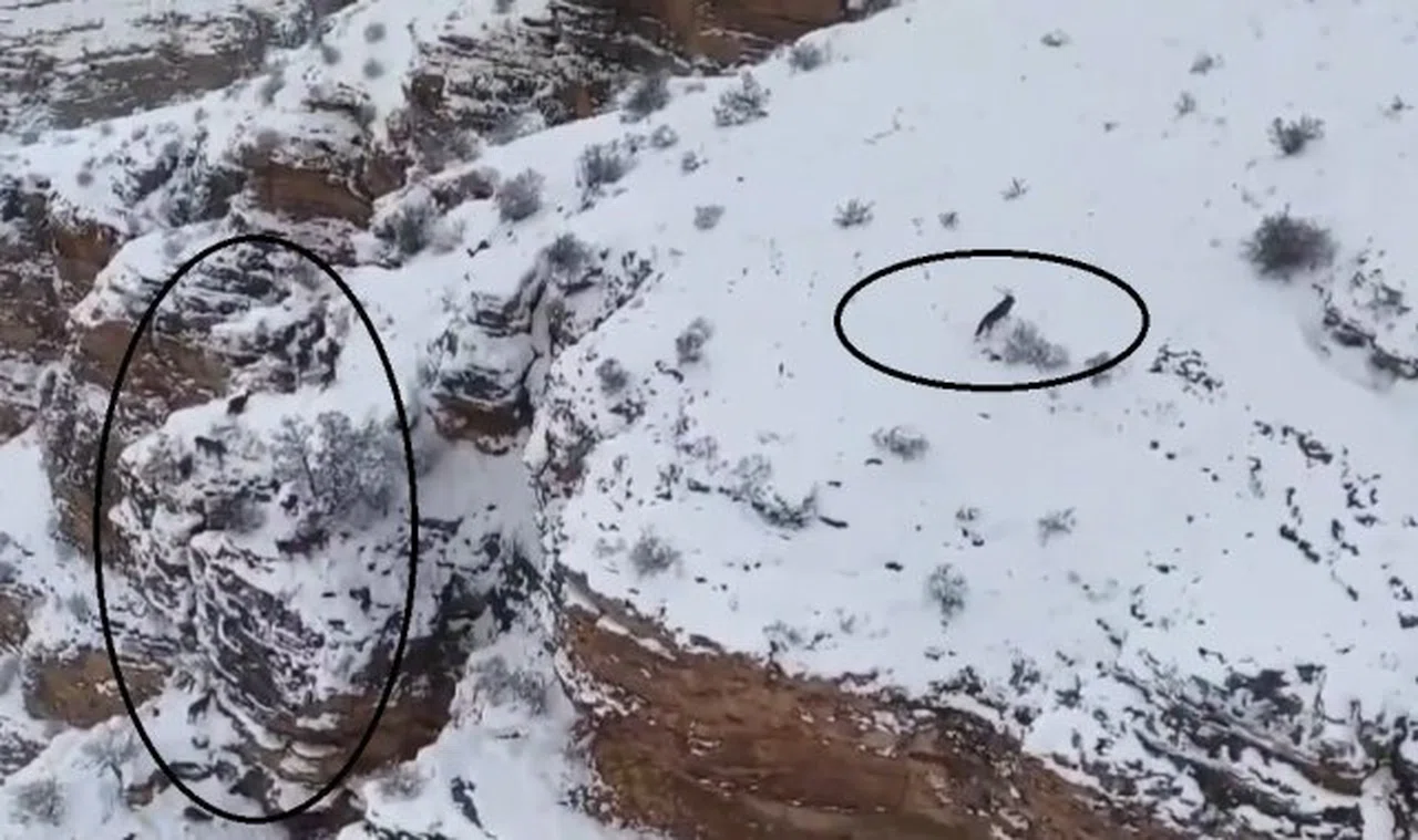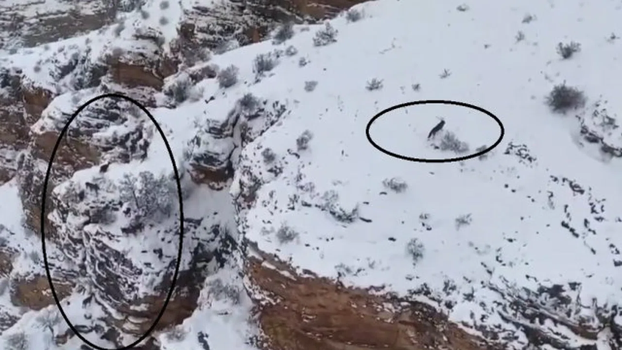 Mevsime bağlı zirvelerden alçak kesimlere inen dağ keçileri kış aylarında göç yoluna koyuluyor. Göç yolunda karlı zirvelere çıkan yaban keçileri drone ile havadan görüntülendi. Dağ keçileriyle birlikte kadraja giren kurt ise dikkat çekti.
