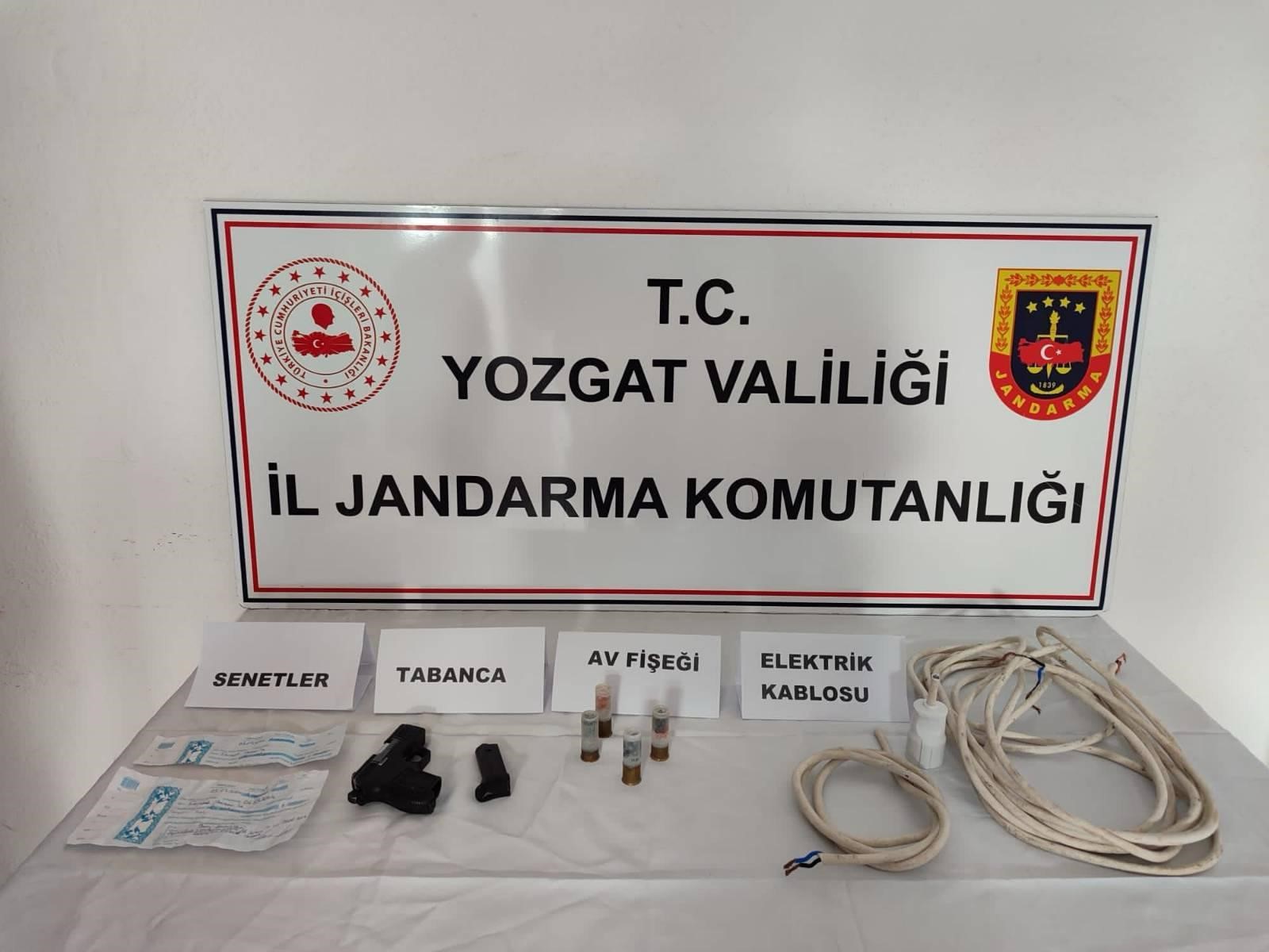 Sorgun ilçesinde otomobillerinin arızalandığı bahanesiyle Y.B."yi (35) arayarak yardım isteyen ve eve çağıran F.Y. (26), evde bulunan arkadaşları M.E. (26) ve İ.T. (27) ile Y.B."yi darp etti. Y.B., silah tehdidiyle 1 milyon liralık senede imza atmaya zorlandı. Kendi imkanlarıyla evden ayrılan ve hastaneye giderek tedavi gören Y.B."nin şikayeti üzerine jandarma ekipleri harekete geçti. Jandarma ekiplerinin çalışmaları neticesinde şüpheliler, kiraladıkları araçla Çorum"a giderken Alaca ilçesinde yakalandı. Şüphelilerin üzerinde yapılan aramada 1 milyon liralık senet ile tabanca ve 4 av tüfeği fişeği ele geçirilirken, gözaltına alınan 3 şüpheli jandarmadaki işlemlerinin ardından çıkarıldıkları adli makamlarca tutuklandı.