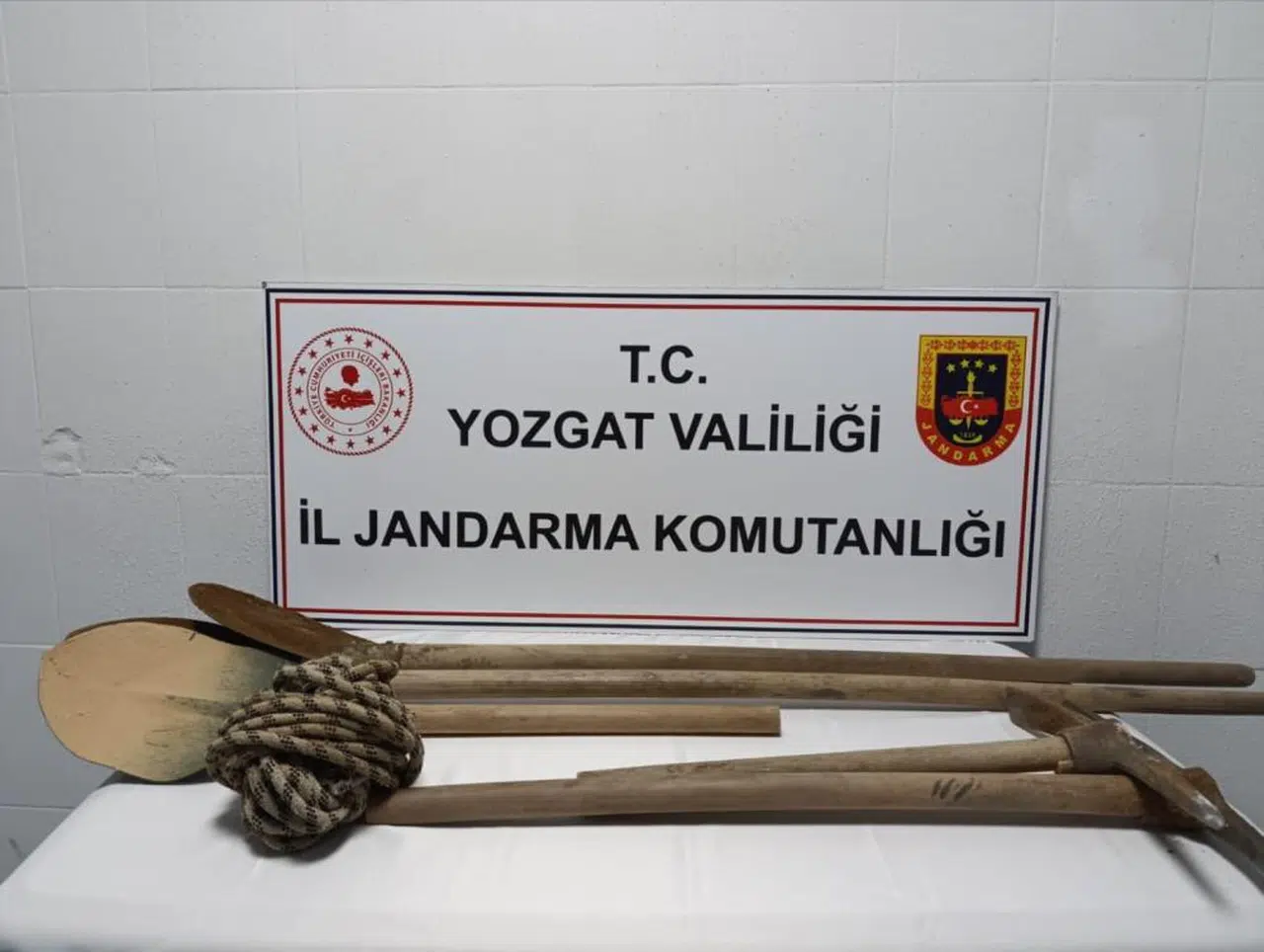 Arazide 3 kişinin izinsiz kazı yaptığını gören Jandarma ekipleri, F.K., G.K.ve M.A.isimli şüphelileri yakaladı. Şüphelilerle birlikte 3 adet kürek, 2 adet kazma, 25 metre halat ele geçirildi.