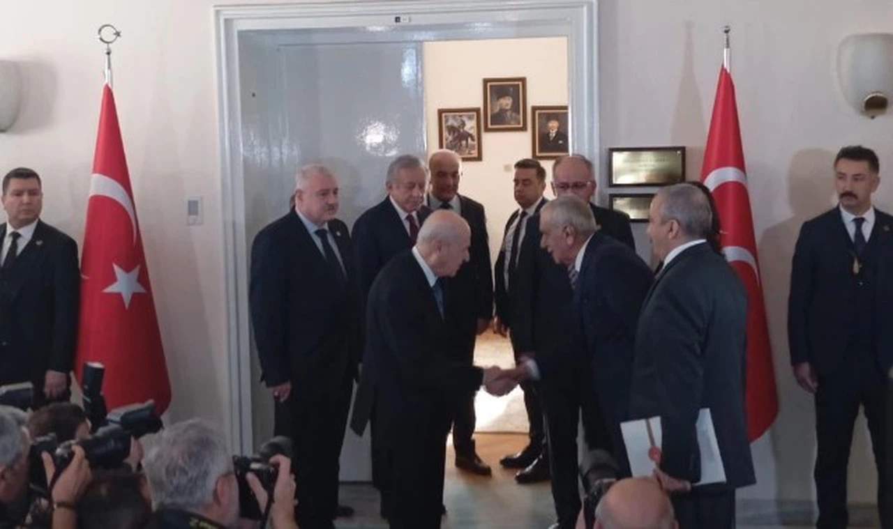 Heyet, Kurtulmuş ile olan görüşmesinin ardından TBMM"de MHP Genel Başkanı Devlet Bahçeli ile bir araya geldi. Bahçeli"nin TBMM"deki makamında gerçekleşen görüşme öncesinde Bahçeli, DEM Partili heyeti kapıda karşılayarak, heyetle tokalaştı. Görüşmede Bahçeli"ye MHP İstanbul Milletvekili Celal Adan da eşlik etti.