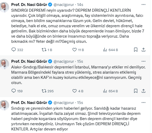 Balıkesir’in Sındırgı ilçesinde meydana gelen 6,1 büyüklüğündeki deprem sonrası Yer Bilimci Prof. Dr. Naci Görür, önemli uyarılarda bulundu. Depremin ardından sosyal medya hesabından peş peşe açıklamalar yapan Görür, bu olayın en büyük mesajının “Deprem dirençli kentler” gerektiği olduğunu vurguladı.