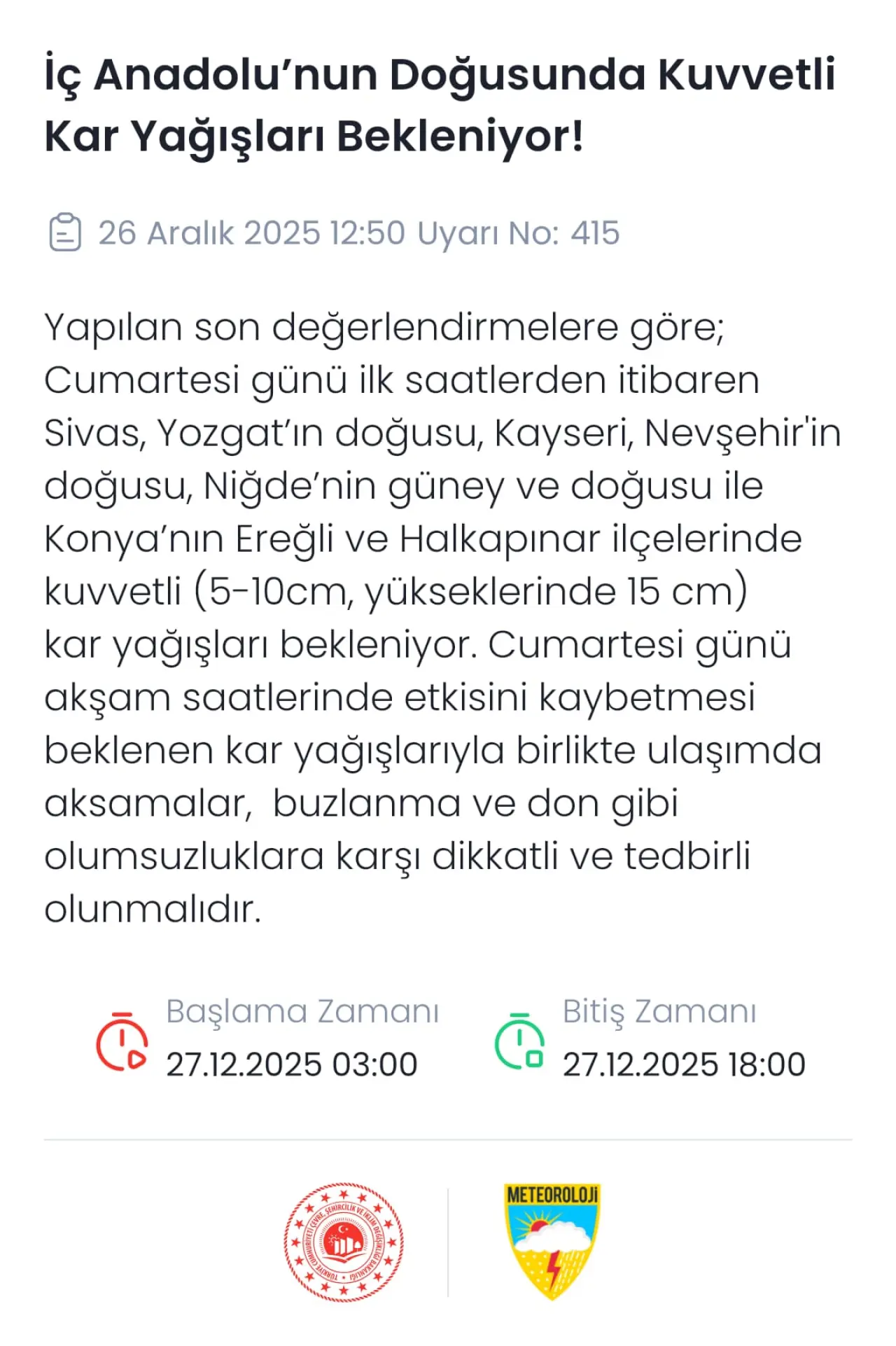 Meteoroloji’den yapılan açıklamada, 27 Aralık Cumartesi günü sabah saatlerinden itibaren kar yağışlarının başlayacağı bildirildi. Uyarıya göre; Sivas genelinde kuvvetli, yüksek kesimlerde ise yer yer 15 santimetreyi bulabilecek kar yağışı öngörülüyor.