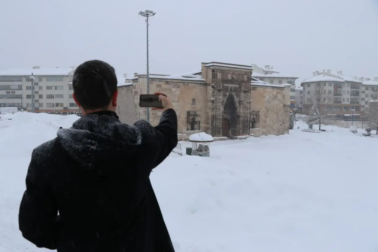 Selçuklu ve Osmanlı mimarisinin en nadide örneklerini bir arada barındıran Tarihi Kent Meydanı, karla birlikte bambaşka bir kimliğe büründü. Çifte Minareli Medrese’nin heybetli kapıları ve Şifaiye Medresesi’nin asırlık duvarları, kar taneleriyle süslenerek adeta birer sanat eserine dönüştü. Tarihin soğuk taşları, beyazın zarafetiyle buluşunca ortaya çıkan görüntü izleyenleri hayran bıraktı.