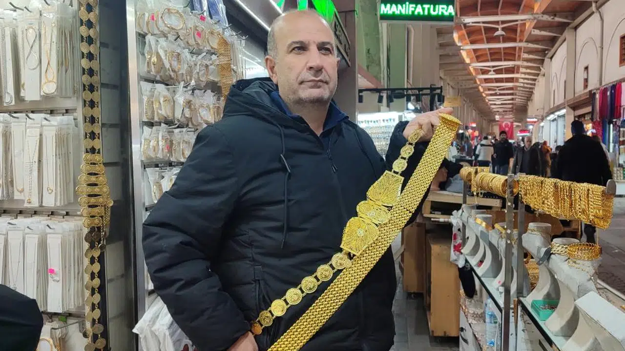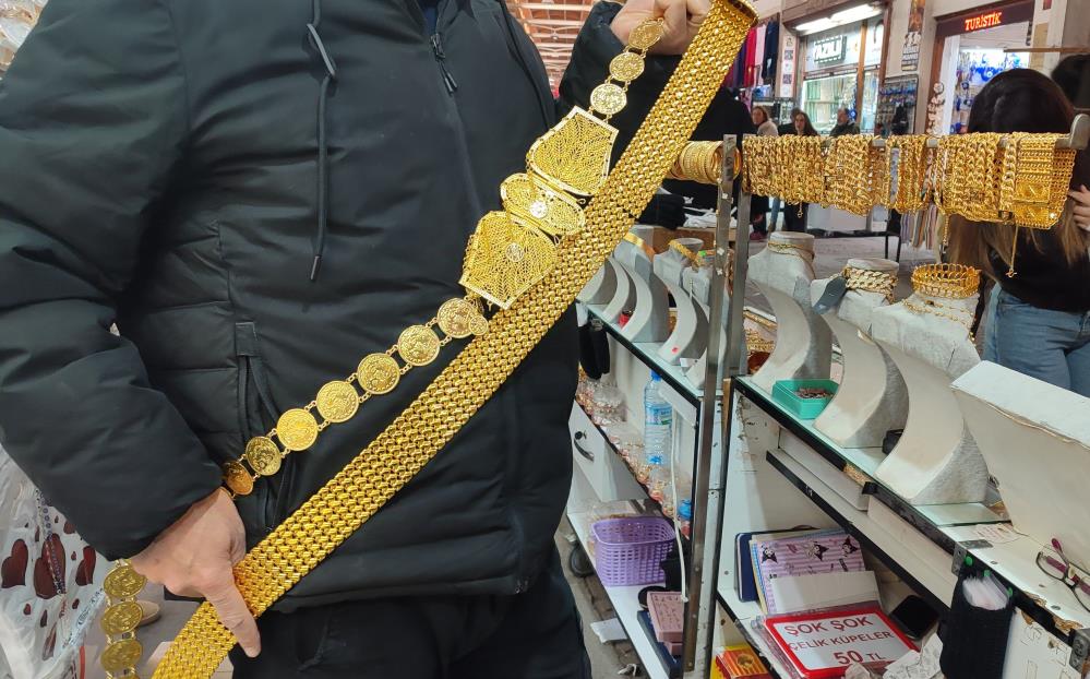 Altın fiyatlarının yükselmesiyle birlikte düğün yapacak kişiler imitasyona yöneldi. Kahramanmaraş'ta tarihi Kapalıçarşı'da altın kemerin imitasyonu bin TL'ye satılıyor.