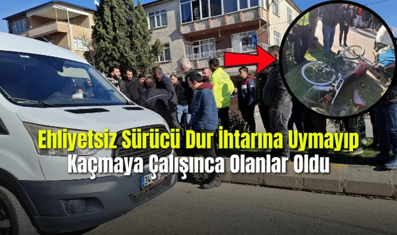Sakarya'nın Akyazı ilçesinde 'dur' ihtarına uymayarak polisten kaçmaya başlayan ehliyetsiz sürücü, plakasız motosikletle girdiği ters yönde kaza yaptı. Yaralanan motosikletli, hastaneye kaldırılarak tedavi altına alındı.