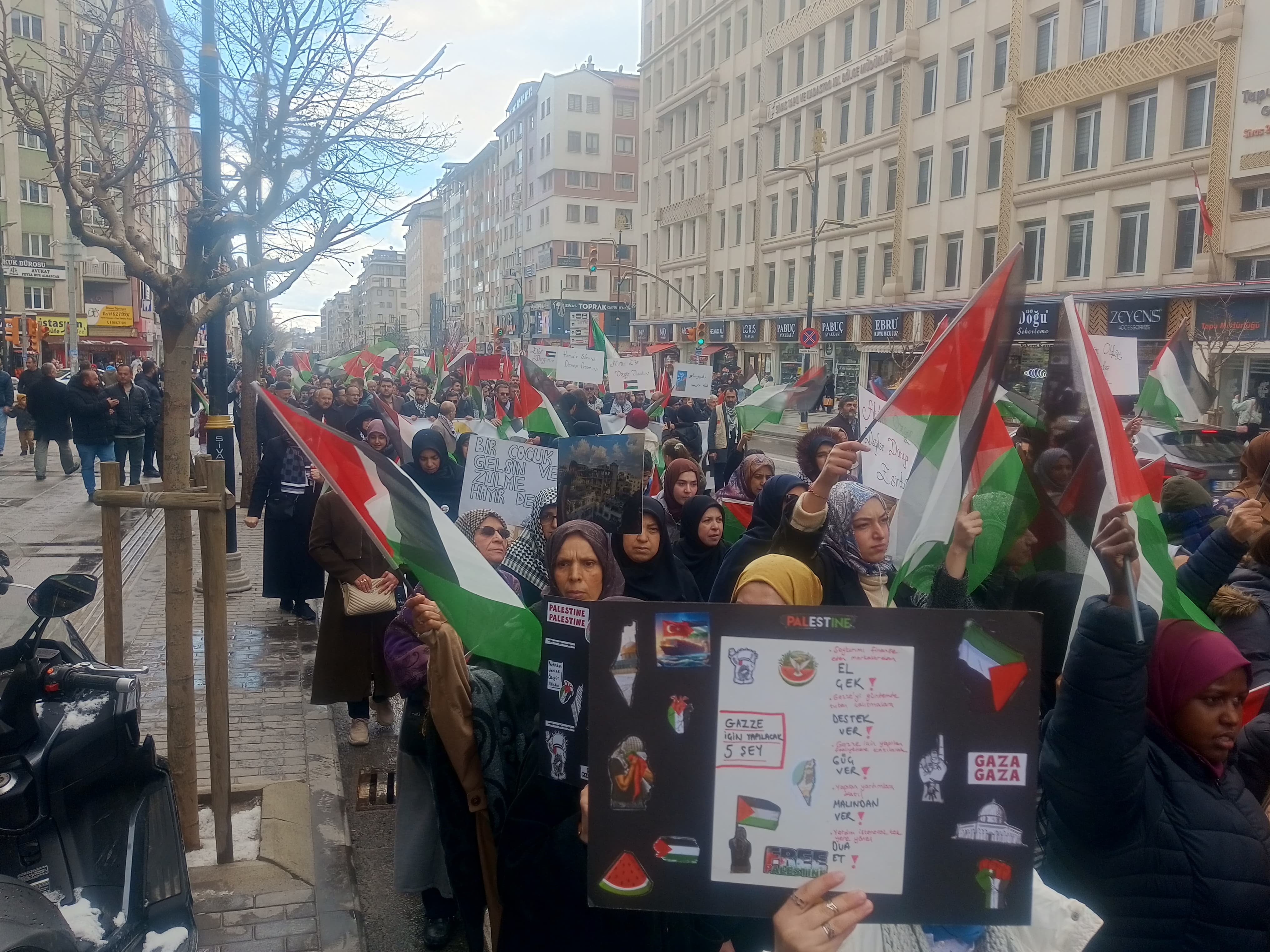 Yürüyüş boyunca taşınan pankart ve atılan sloganlarla Filistin halkına destek mesajları verildi.