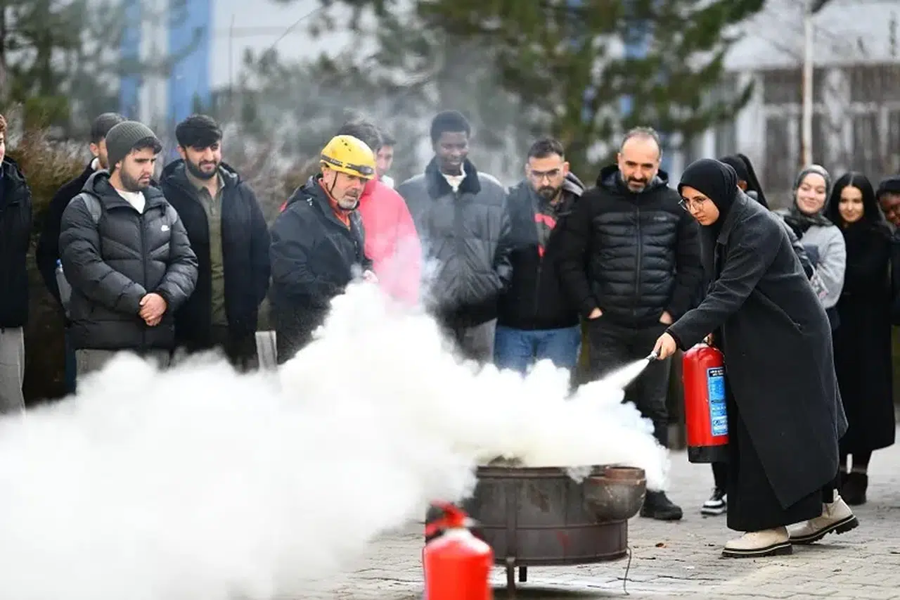 Tatbikat kapsamında Öğr. Gör. Kemal Demetçiçek, yangın söndürme ekipmanlarını öğrencilere tanıtarak, yangın tüplerinin doğru ve etkili kullanımı hakkında bilgilendirmede bulundu. Senaryo gereği kontrollü şekilde yakılan ateşe, öğrenciler birebir müdahale ederek yangın söndürme tekniklerini uygulamalı olarak deneyimledi.